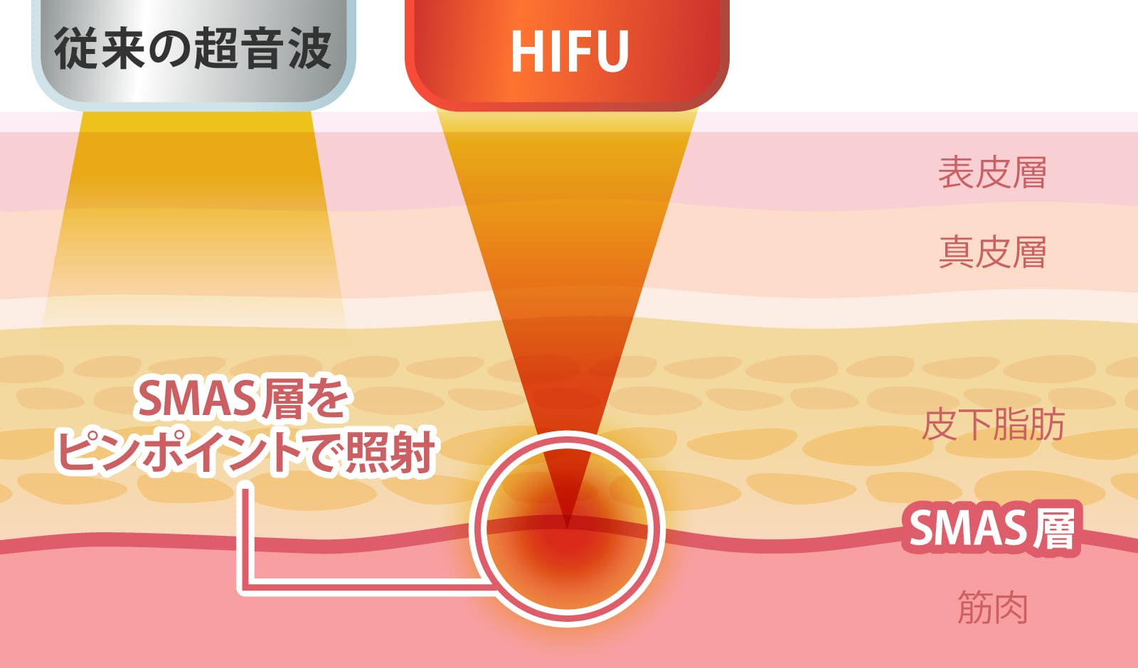 主にお顔のたるみを改善し、リフトアップする施術の一つで、肌の土台であるSMAS層(筋膜)に高密度の超音波エネルギーを照射することで、肌の内部だけに熱損傷を起こさせます。